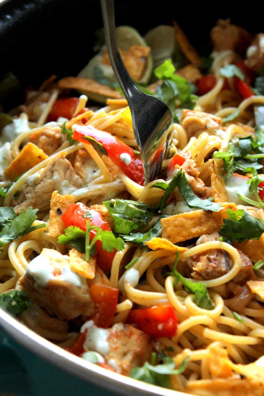 - Serve the pasta hot, drizzled with the crema with leafy cilantro and crunchy tortilla strips scattered over top