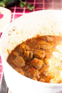- For stovetop: Add 2.5 cups of hot water, bring to a boil then simmer for 45-55 minutes or until meat is cooked through and breaks with some pressure. For IP: Add in ¾-1 cup of hot water, cook on high pressure for 20 minutes then quick release for beef, for mutton check after 15 minutes. (see notes)