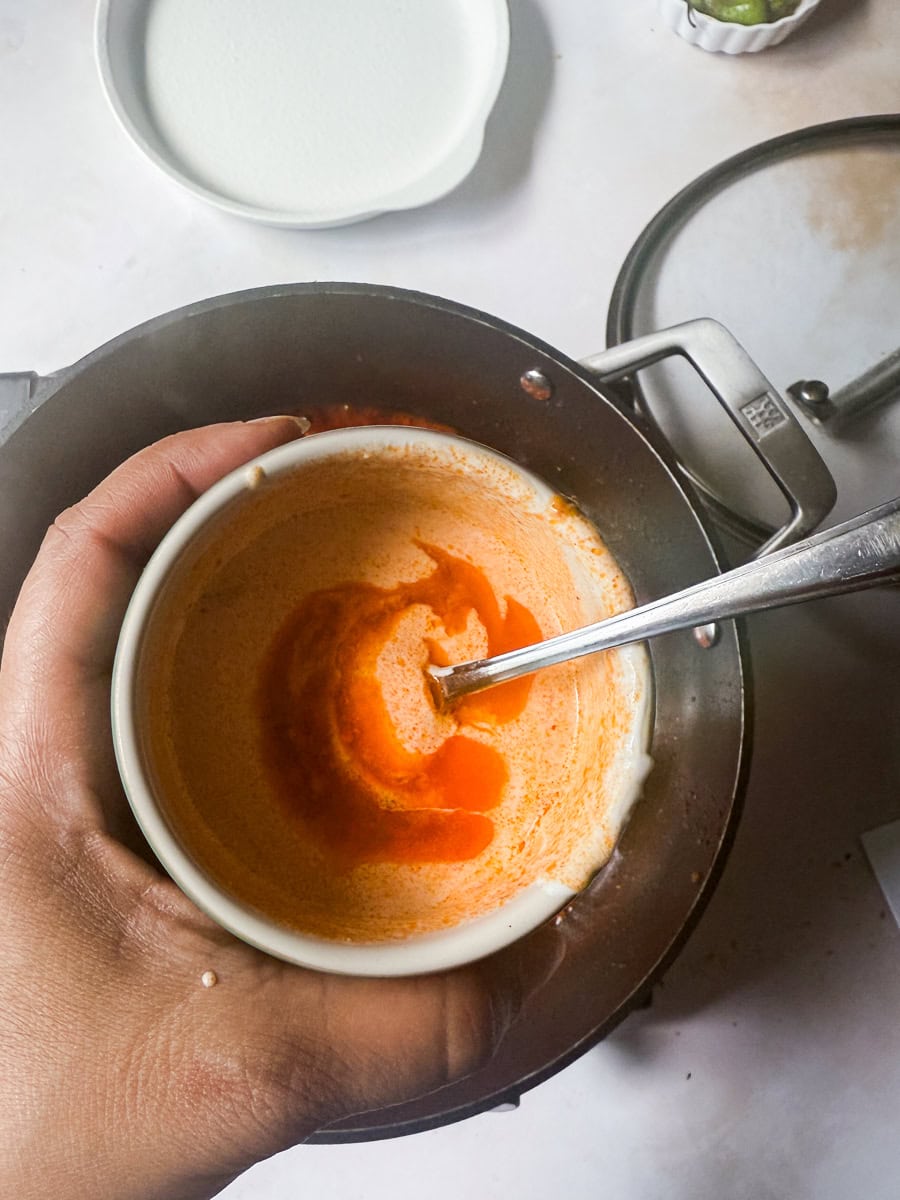 - Once the chicken is cooked through take some of your masala and add it to your yoghurt and then slowly mix the yoghurt back into the achar chicken.