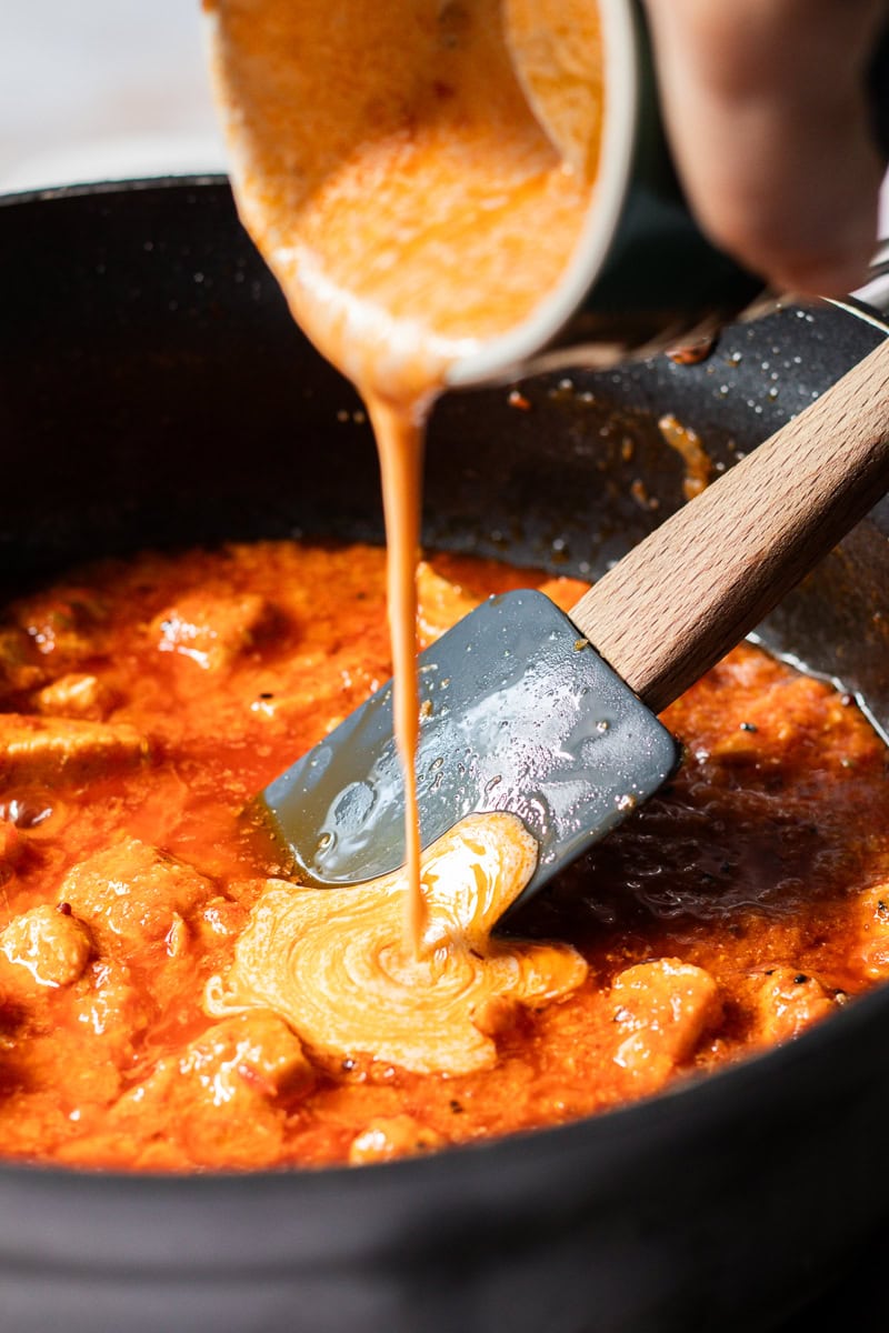 3.) How to add yoghurt: Yoghurt splits because of a temperature differential between the colder yoghurt and the hot masala. Bridge that difference by whisking your masala into the yoghurt before adding it back in.