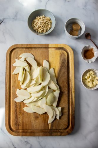 - Arrange your apple slices over the puff pastry sheet, reserve the smaller pieces for the centre.
