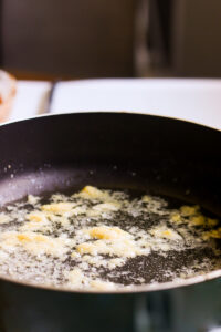 - Heat ¼ cup of oil in a large saute pan and add your ginger and garlic pastes and cook on medium high heat until they no longer smell raw - about a minute.