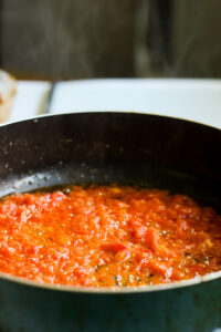 - Now add your diced tomatoes and cook, sauteing occasionally until the excess water dries and the oil rises above the tomatoes.