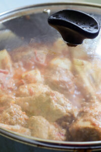 - Add your potatoes, aloo bukharay (if using), half a cup of water, cover the pot, and bring it to a simmer, cooking for 25 minutes or so or until the chicken is tender. Check on it halfway through to see if the masala is sticking (add more water if it is), but otherwise there's no need to disturb it.