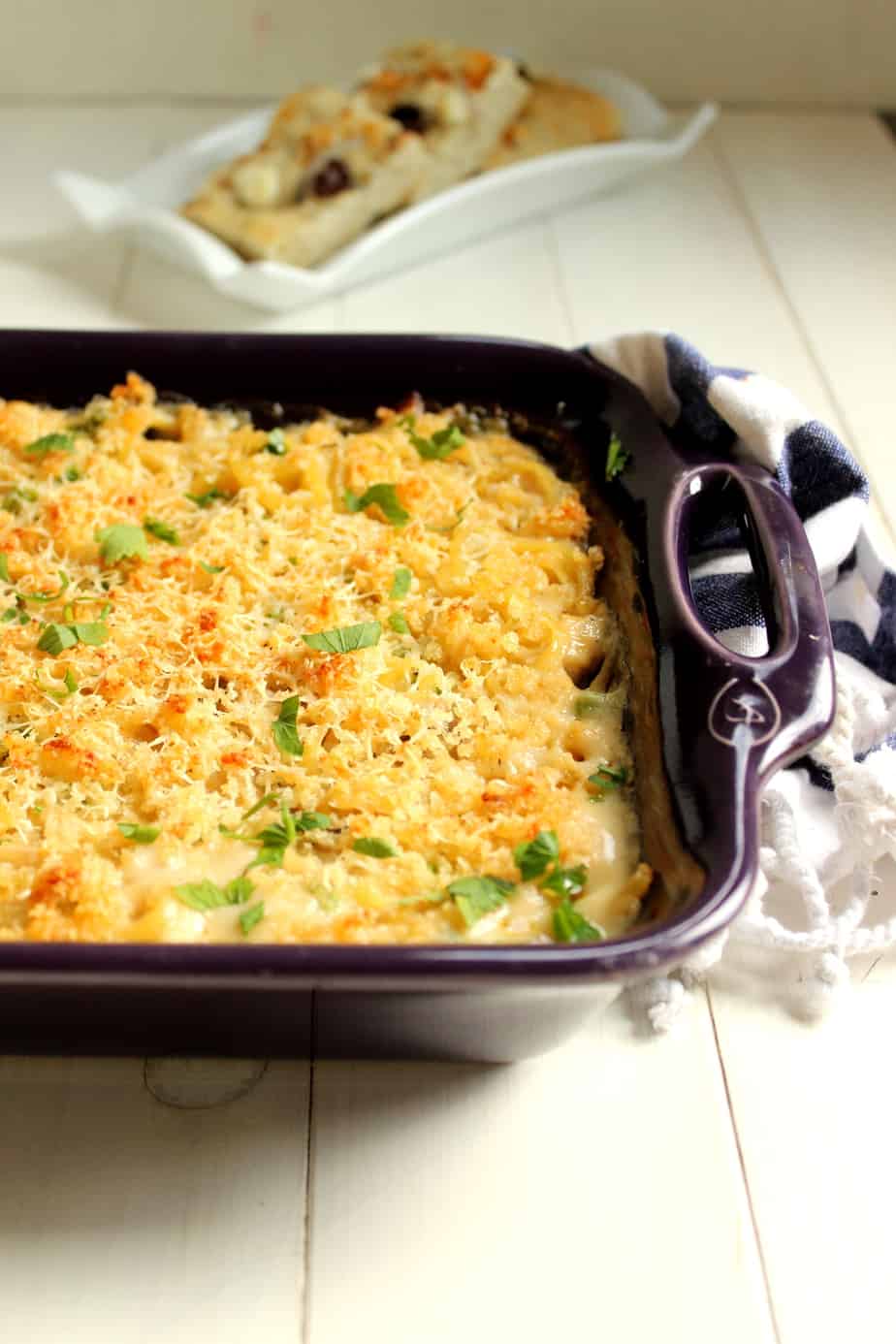 - Mix in the cooked pasta and put in a lightly buttered dish. I used a 11*7 dish, but a square 9*9 would work too