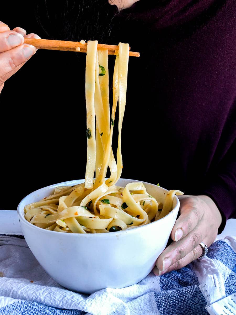 Most food is table food. It requires mats, cutlery, glasses - for you to sit up straight or at the very least tell your children to. Then there are these Chili Garlic Noodles. They are solidly couch food. They belong at the end of that long day, a day where all you want is some comforting carbs on the couch. They're the kind of flavorful noodle you pile into a bowl, walk over to the couch, put your feet up and dig into as you do a little binge watching. You know that kind of day and I know you know that kind of food.