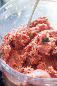 Keema: Now usually I am team extra lean, but here you want a little fat on here. The more fat you have the juicier your kabab will be, but it will also shrink so I still lean towards the leaner keema at 20% fat.