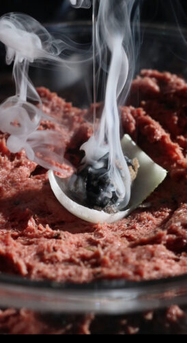 - While it's heating place an onion peel or a piece of foil in the bowl with the meat mix, on top of the meat. Once the coal is hot place it on top of the onion/foil and drizzle a little oil on it. It will immediately smoke up. Cover and let it sit for 15 minutes to let that smoke fully infuse.