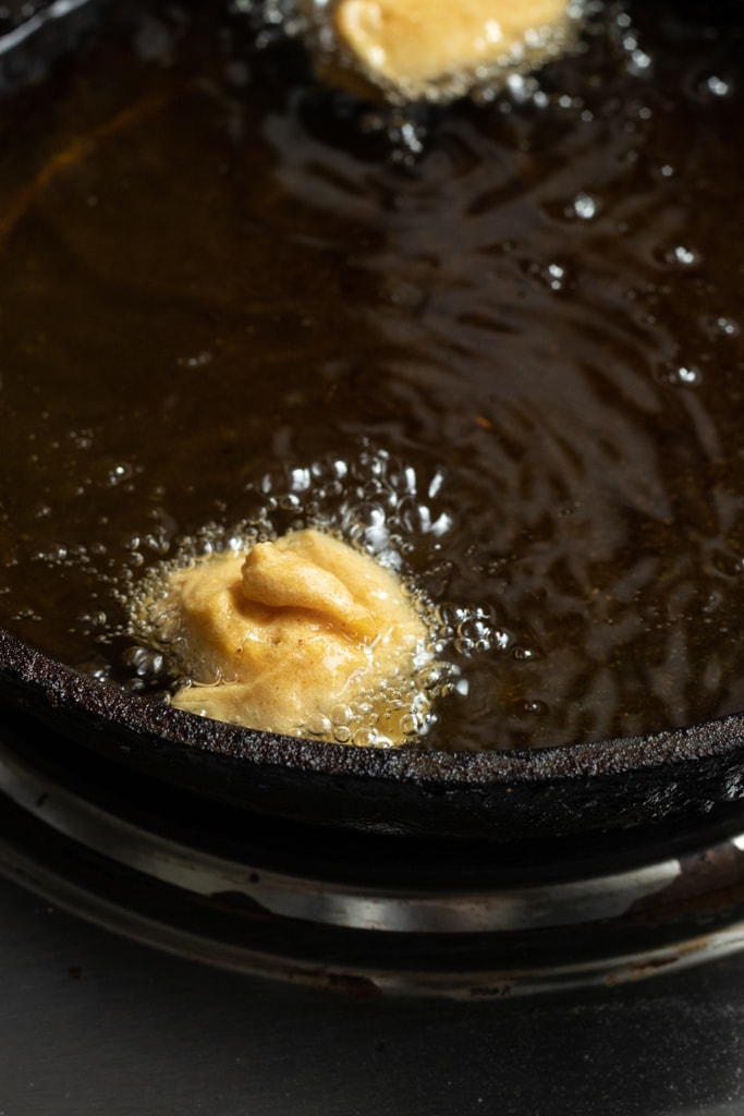 - Drop the mixture by small teaspoonfuls into the hot oil making sure not to overcrowd. The pakoras will expand as they fry but they will also expand when added to the karhi. Fry for 3 minutes on each side or until deeply golden.