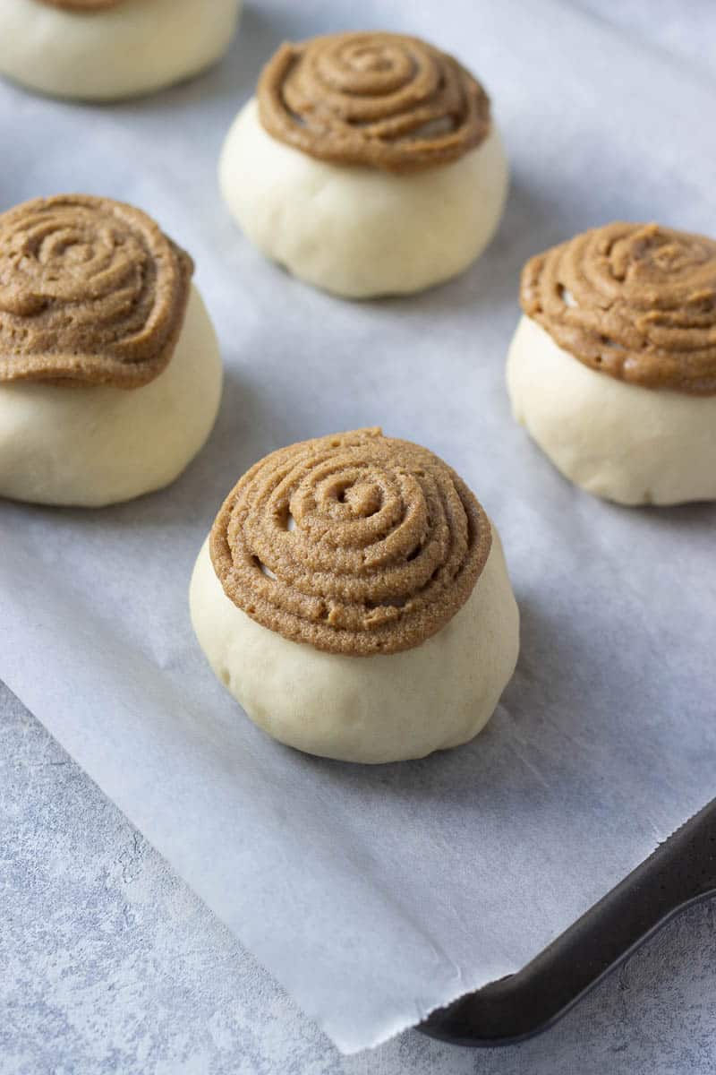 - Leave them to rise on a lined baking tray for 45 minutes. Gently cover the top with a kitchen towel or a piece of plastic wrap. The dough balls will expand some but this step is important for the texture of the buns!