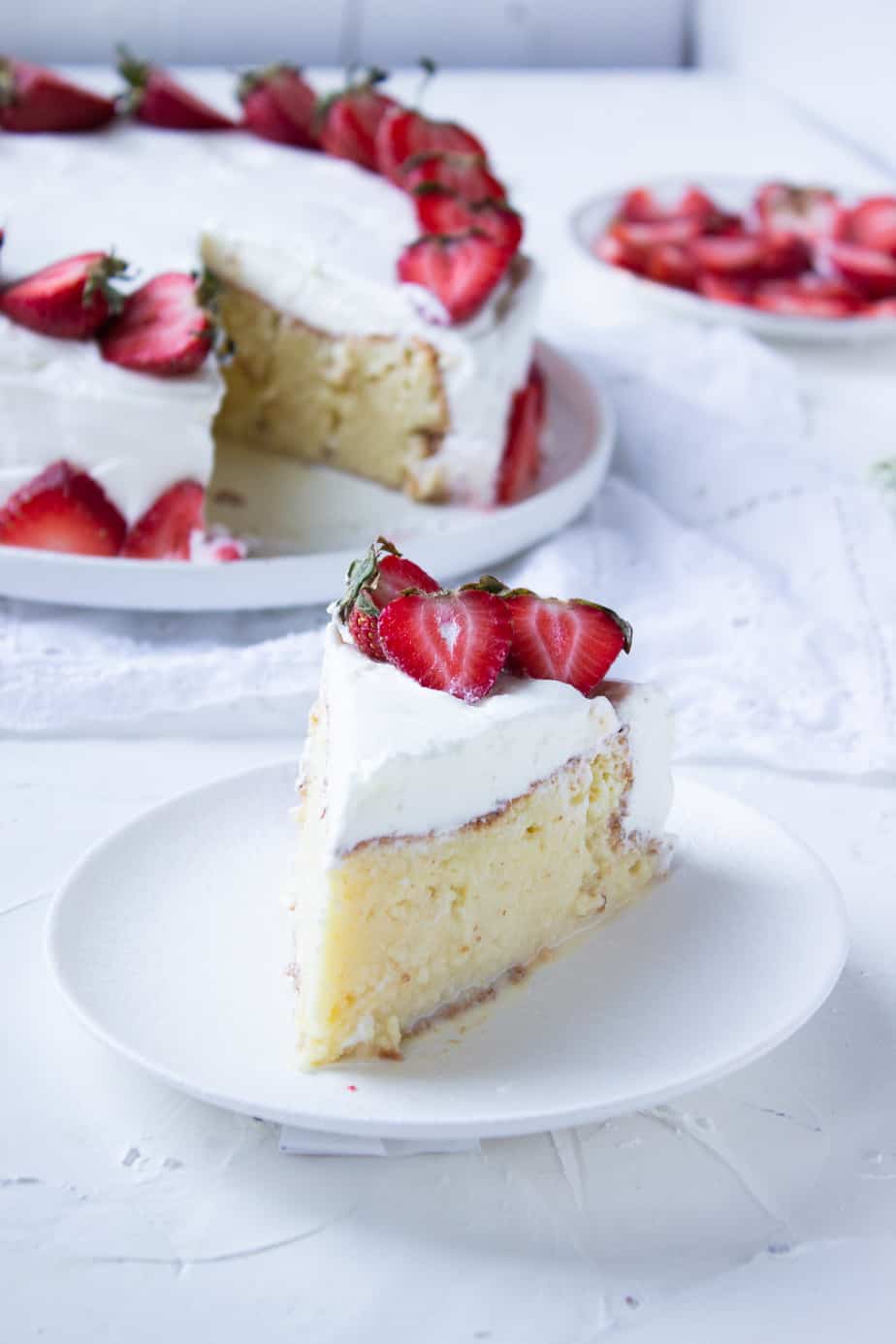 Tres Leches Cake is a classic Mexican dessert that is different from anything else I have had. In it the cake itself literally gets soaked with a milk mixture. Top it with pillowy whipped cream and your favourite fruit and you have a dessert that is both light and indulgent . The Tres Leches cake is traditionally made in a dish and the milks are poured right on top so they absorb in without any spills. I love making them that way for a crowd but for a smaller group I far prefer the prettier round Tres Leches Cake.