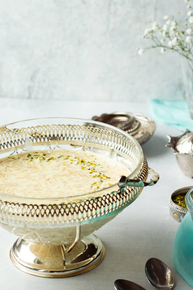 Central to it's unique texture are the ever so slim eggless and wheatless Seviyan noodles (Vermicelli). They are used almost exclusively in desserts in Pakistani food, but you can use them for savory dishes as well.