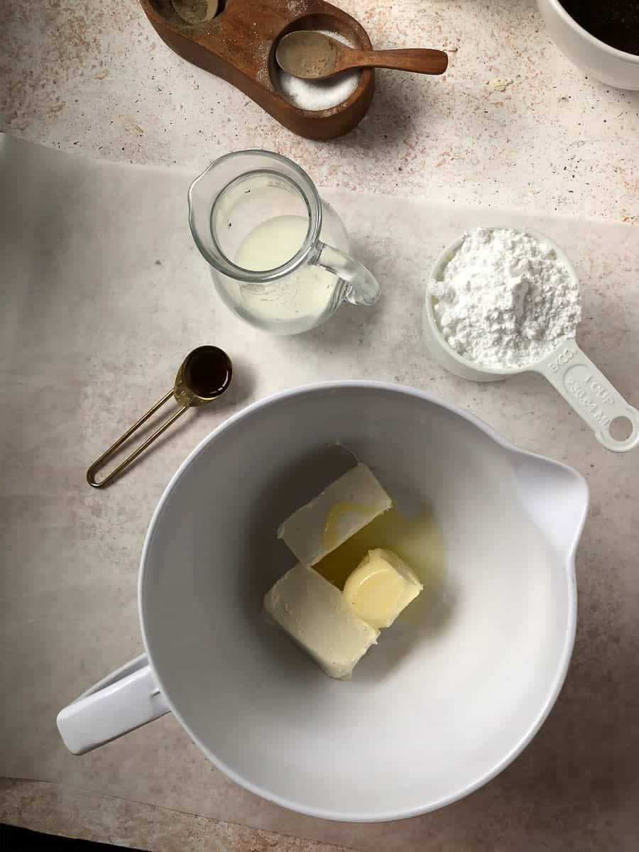 - On low speed add in 1 cup icing sugar, ½ tsp vanilla, and 2 tbsp milk until well combined.