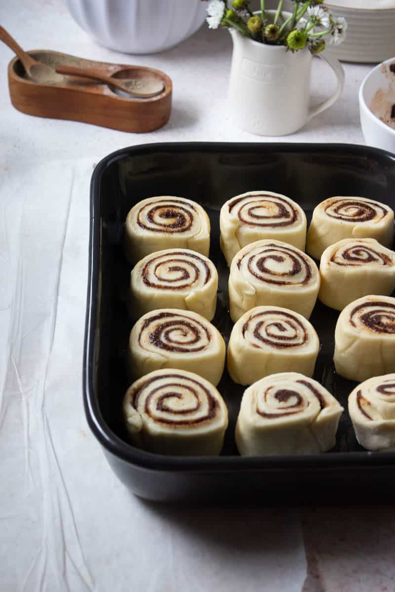 - Roll the dough into a tight spiral starting from the 18 inch side and then cut into 12 even pieces