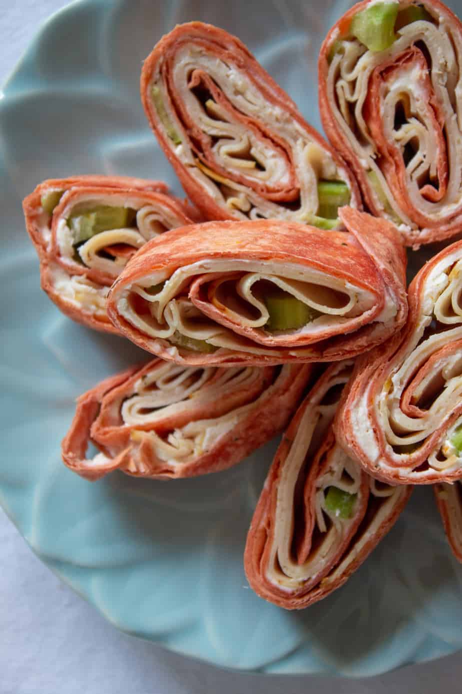 - Layer on half the turkey, roll up, and cut into spirals. Repeat for a second set of rolls.