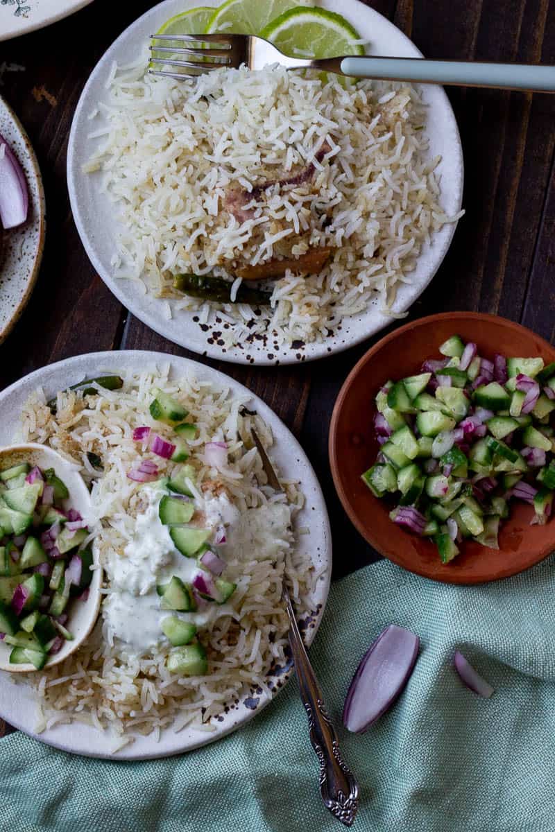 This White Biryani is cooked in two pots: one for the rice and for the chicken and they're then layered and steamed.